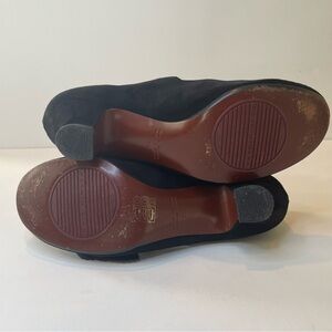 Chie Mihara pumps from Anthropologie. Black suede with raised black floral design embellishment on exterior toebox.