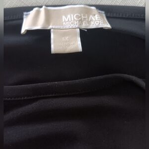 This sophisticated black blouse by Michael Kors showcases a fitted silhouette with long sleeves, adorned with gold studs on the cuffs. The decorative detailing around the cuffs adds a touch of glamour, while the stretchy fabric ensures a comfortable and sleek fit. Perfect for dressier occasions, this top effortlessly blends classic style with modern elegance.