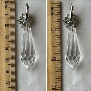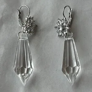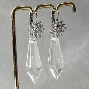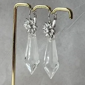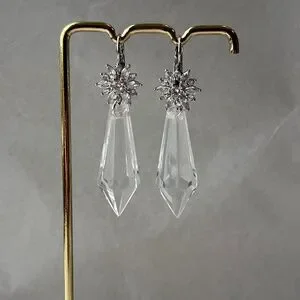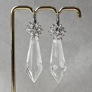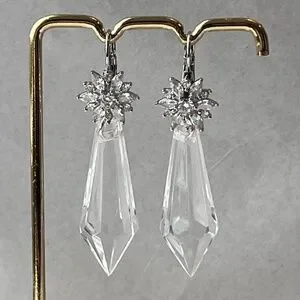 These earrings feature as their base tall silver hinge back hoops with a rhinestone floral burst on the fronts. Dangling from these is an acrylic crystal in a three dimensional teardrop shape. These earrings have been newly handmade just for you, and measure approximately 60 mm long and 12.7 mm at the widest point (about 2.36 inches long, 0.5 inches wide). Similar replicas are sold online for $90.