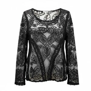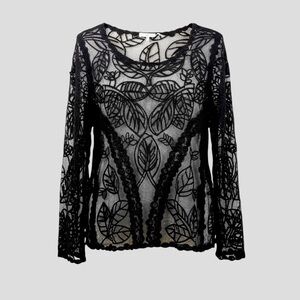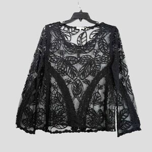 Sheer black embroidered mesh lace top by Capri, size XL. It moves softly, feels textured and looks dark, but romantic with gorgeous floral design that elevates WhimsiGoth aesthetics. A beautiful, romantic layering piece belongs at candlelit concert or forest midnight picnic.
