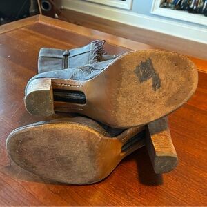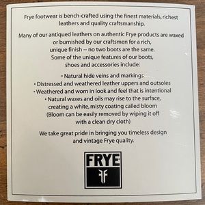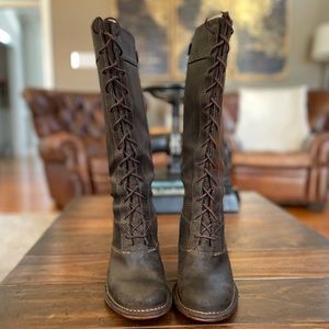 These vintage Frye Villager Lace boots are in a special dark chocolate brown suede leather with natural variations. The soles are leather. Conveniently they have a zipper to put on easier. All Frye products are built to last. These are the type of shoes you take to a cobbler for extending the lifecycle. 13” shaft height