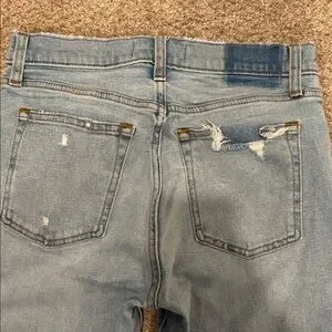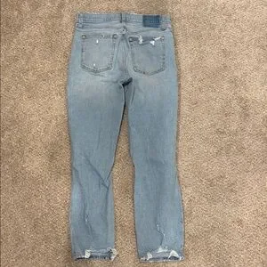 High rise skinny jeans. Light blue denim. Classic Abercrombie & Fitch style with intentional distressing from manufacturer.