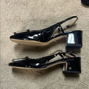 Elegant black patent heels with slingback design. Perfect for any occasion.