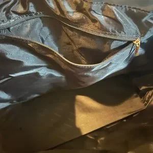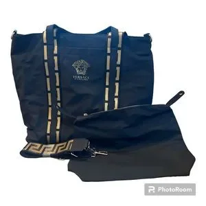 Versace Parfums Tote Medusa Logo Soft Vinyl Black and Gold NWT. Detachable Crossbody Strap, Made Exclusively for Versace Fragrance Collection, Nice, Roomy, Center Snap Closure, Small Outside Slit Pocket with Medusa Logo, One Zippered Inside Pocket, Two Slit Pockets, Removable Zippered Pouch Snapped Inside, Wipe Clean Liner, Black and Gold Versace Logo Detachable Crossbody Strap, Gold Hardware, Four Gold Feet, Dust Bag Included, In Original Packaging, Smoke Free Home Pet Free