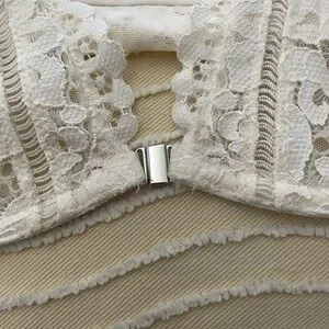 This sexy Body by Victoria white lace bra has an underwire, is unlined, and has a front opening. The beautiful lace has much detail on the edging. See matching panty in different listing.