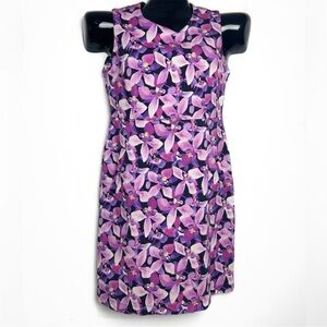 Elegant floral dress with vibrant purple and pink hues. Features a secure zipper closure. Perfect for any occasion.