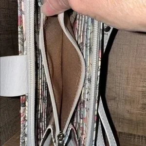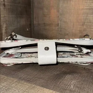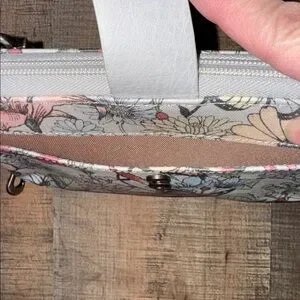 NWOT Charming wallet with floral and butterfly design. Includes a convenient wristlet strap that can be interchangeable to a crossbody (strap) purse. Pouch snap outer pocket— zip for inside middle zip pouch with card slots on each side. Measures approximately 8 X 4.5 inches.