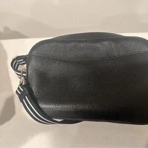 Elegant black bag by Kate Spade. Features a striking black and white striped strap. Ideal for daily wear. Only used twice. With matching wallet.