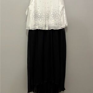This elegant kids formal dress features a classic black and white design, perfect for special occasions. The top is adorned with delicate patterns, adding a touch of sophistication.