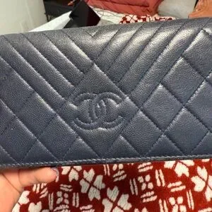 Luxurious CHANEL card holder in dark blue. Features classic quilted pattern and iconic logo.