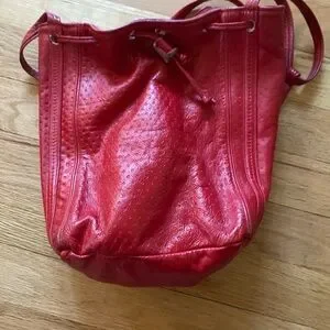 Red leather bucket bag with adjustable straps leather. No brand tag. See pics for measurements. Cute stripes inside. #boho #bucketbag