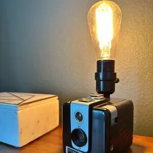 Bring a nostalgic glow to your space with this one-of-a-kind desk lamp made from a vintage Kodak Brownie Hawkeye camera. Features a working Edison-style bulb mounted securely where the flash would attach. The lamp is fully functional and makes a fantastic statement piece for any industrial, retro, or photography-themed room.