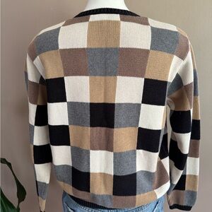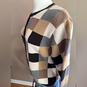 Chic checkered cardigan with button-up front. Features cream, brown, and black squares. Perfect for layering.