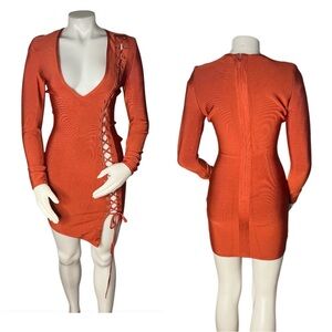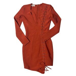 Featuring an ultra-sexy deep plunge V-neckline and elegant long sleeves, balancing the sultry mini-length cut. The striking lace-up detailing to the sides adds a perfect flash of skin and an edgy, corset-inspired feel, cinching the waist for an hourglass silhouette. Finished in a rich Burnt Orange, rust hue, this dress is the ultimate statement piece for party season. Preowned with no major flaws.