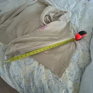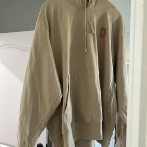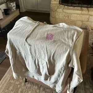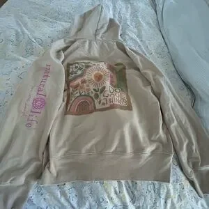 Natural Life XL ladies Tan hoodie featuring a vintage boho look with colorful graphic design with floral and sun motifs. 'Do Good Things' text on the back. Please see pictures for wear and condition for this used oversized hoodie.