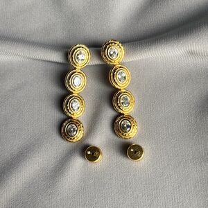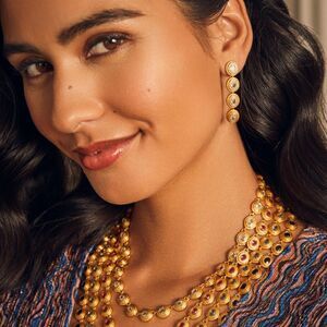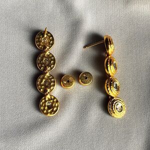 Four tiers of oval rose cut gemstones are set in lightly hammered golden walls and linked together for a dramatic earring that moves with you.
