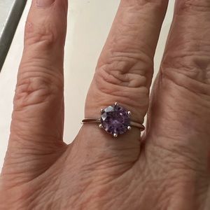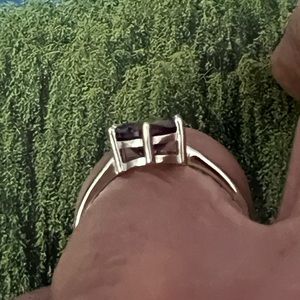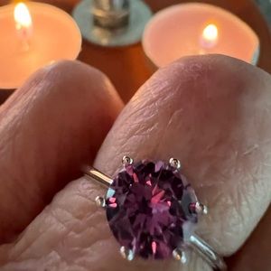 This is the only Alexandrite I have and please check prices of other rings - they are much more expensive - some in the hundreds of dollars. This Solitaire Alexandrite ring set in 925 sterling silver ring. The Alexandrite is a color changing stone depending on the lighting (daylight, candlelight, different types of light bulbs). I tried capturing the colors in different lighting. The band is thin and comfortable to wear. Marked 925. New. This is an extraordinary gem. Set in a lovely six prong setting. It looks to be about two carats.