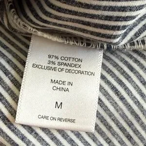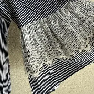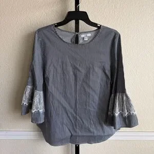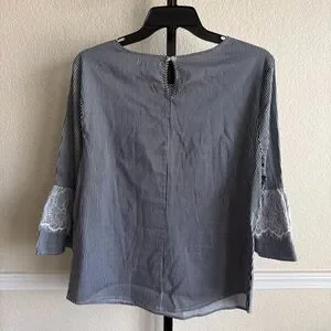 New York & Company navy/white striped blouse with lace bell sleeves and keyhole back, cotton blend.