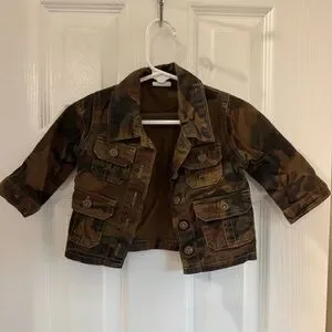 Trendy Wrangler jean jacket with a camouflage pattern.