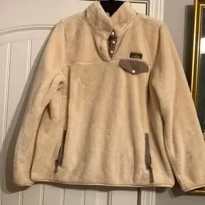 LLBeam cream ladies fleece top, sz L. Approx Pit to Pit 22”, two pockets with zippers, great condition, smoke free environment. Ty