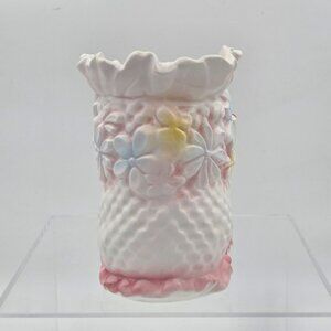 Charming Napco nursery planter modeled as a baby shoe, pattern C-7707. Hand-painted ceramic with a large pink bow and embossed blue and yellow flowers along a basketweave body. Original Napco foil sticker remains on the base. Typical of Napco’s post-war imports.