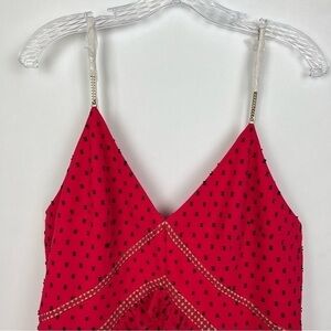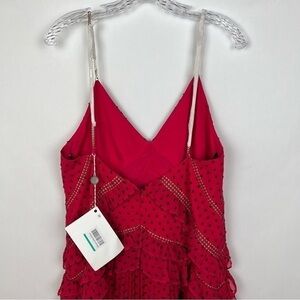 Elegant pink maxi dress. Features delicate lace and ruffle details. Spaghetti straps and open back design. Perfect for special occasions.