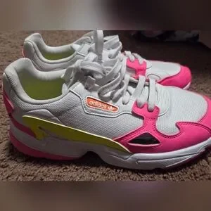 Stylish Adidas sneakers in white and pink with yellow accents. Women's size 10. Perfect for casual wear.