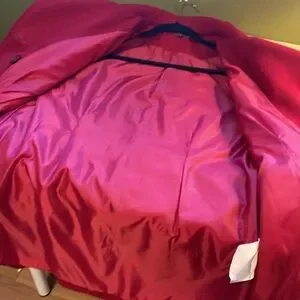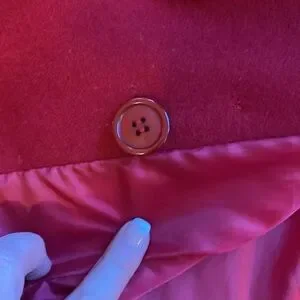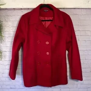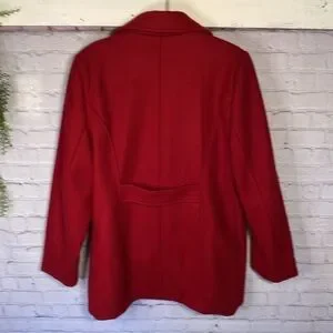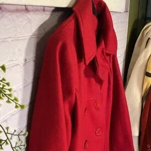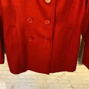 Very nice quality wool pea coat in a classic double breasted style. It has two functional front pockets and is lined on the inside. Perfect bright red for the Christmas holiday winter season ahead. Extra button on the inside if you ever need it.