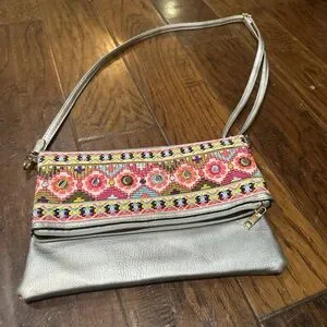 Vibrant Embroidered Silver Crossbody Clutch