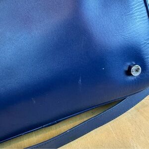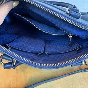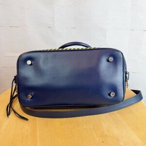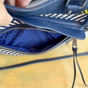 Rebecca Minkoff blue, black, yellow and white basketweave satchel bag with double handles and detachable crossbody strap. There is an exterior zipper pocket, multiple interior pockets and zipper closure. Pre-owned. There is some crinkling in the material on the front flap (pictured) and some minor spots and scuffs. Does not come with dustbag.
