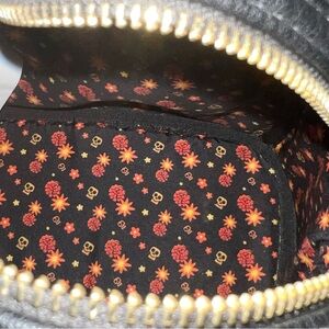 The magical graphics feature embroidery reminiscent of the marigold bridge from the film! Additional details include a front button flap pocket, main zip compartment, brand badge, guitar zipper pull, debossed details, gold tone hardware, two side pockets, and adjustable straps.