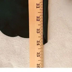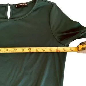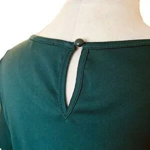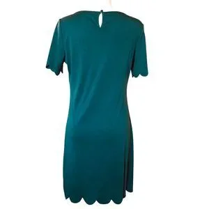Pre-owned Shein dress in good condition. Features a scalloped hem and sleeves, a round neckline, and a flattering shift silhouette. The color is a deep teal green.