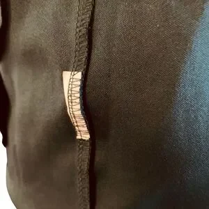 There is a small fabric snag on the front near the thigh area not very noticeable when worn, but shown in the photo for transparency.