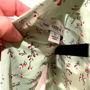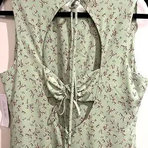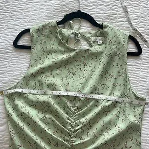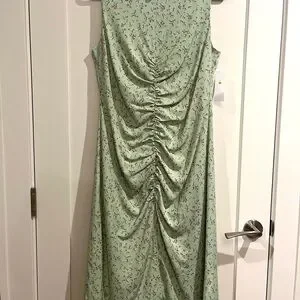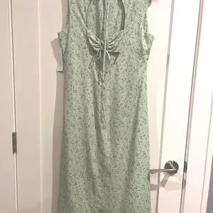Green floral polyester blend (98% Polyester, 2% Spandex). Hourglass. Crew neck. Sleeveless. Tie closure. 45" from shoulder to hemline. 15" slit. Imported.
