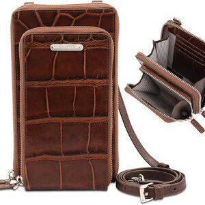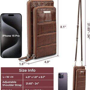 Features: Made from premium croc-embossed Italian cowhide leather, this bag is both stylish and durable. It offers two spacious zippered compartments that can fit phones with bulky cases, plus room for up to four cards or IDs. Comes with a back slip pocket and an adjustable, removable strap for a perfect fit.