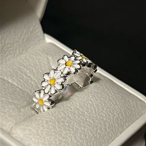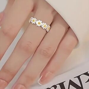 Dainty Enamel Daisy Flower Stackable Delicate Adjustable Silver Tone Ring NEW