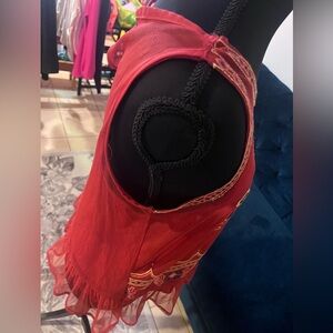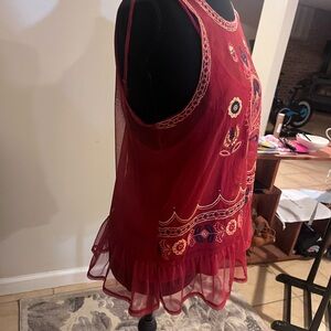 Boho Chic red top with floral embroidery. Features a flowy hem and sleeveless design. Ideal for casual elegance.