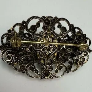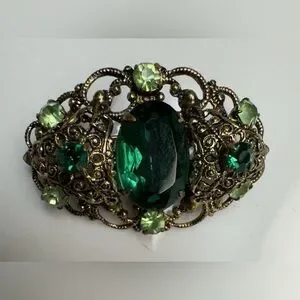 Gorgeous vintage brass-tone brooch with emerald and light green rhinestones set in detailed filigree metalwork. Mid-century design (1940s–1960s) with secure pin back and beautiful aged patina. Perfect statement or collector piece.
