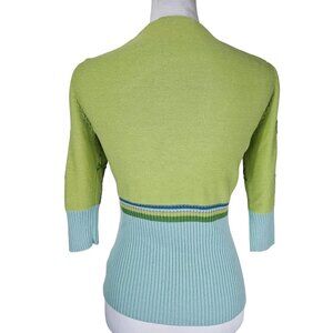 women's cardigan, Michael Simon, multicolor sweater, spun silk cardigan, floral sweater, ribbed hem, button closure, three-quarter sleeve, embroidered sweater, v-neck cardigan, silk cotton blend, chic women's wear, unique design, artsy, art to wear, preppy, teacher, unique, vintage, regency, delicate, feminine
