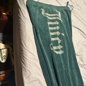 Stylish juicy couture teal velour pants featuring a silver glitter logo on the side. Perfect for a casual and trendy look. Size large ,gorgeous shade of teal blue with beautiful rhinestone crystal juicy logo on side.