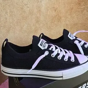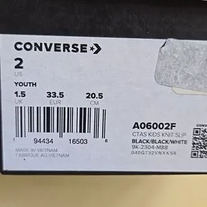 New in Box-Classic Converse sneakers with a comfortable knit slip-on design. Chuck Taylor All Star Easy-On Knit sneaker is a classic design with the convenient slip-on closure. The knit upper and sock like fit allow for breathable steps, while the laces add extra security. Great for school, playdates and everything in between. Unisex sizing-Size 2 Youth- Black and White in color, slip on, knit upper, cushioned insole, rubber outsole.