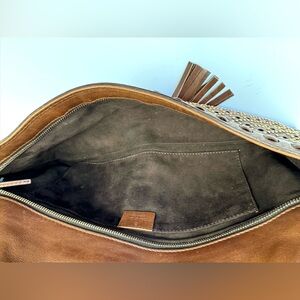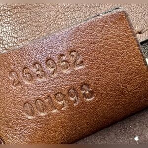 The exterior is a soft buttery brown leather with gold studs, the interior is a rich dark chocolate brown suede. There are no tears or rips. I stored this bag with an interior purse form to maintain the shape of the leather, in the Gucci dust bag (included), in temperature controlled closet, in a handbag display case. Smoke free, pet free home.