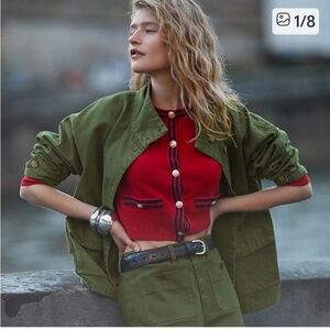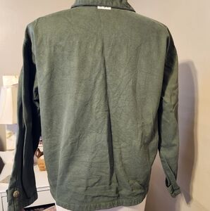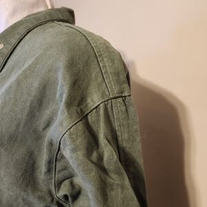 J Crew's Field cargo style jacket with front flap pockets in a heavy twill in this Falls color, army/olive green. Button front, collar, and buttoned strap on the sleeves. Ap to ap 23", sleeve length 24", and full length 25". It is in excellent condition. I also have a jacket in this color in suede. So, I decided to sell this one.