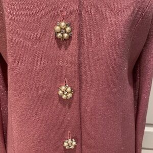 Chic pink 2 pc. Knit featuring delicate beadwork and a pearl accent. Ideal for a stylish look.