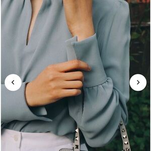 Elegant blue blouse with pearl button details. Long sleeves and keyhole neckline. Perfect for a chic look.