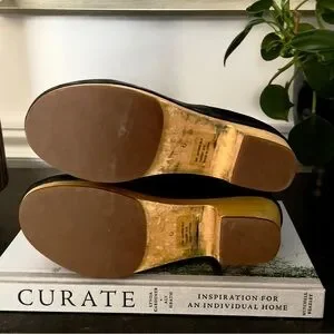Frye and Co. black leather and suede clog boots in a size 6. The leather and suede are in EXCELLENT condition with no scratches or marks. The wood shows some minimal wear as shown in the photos but this could easily be removed with a very fine grit sandpaper and they would look brand new again. I wish they were my size because I wanted to keep them. From a smoke free home.