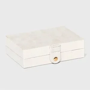 Organize your space with this elegant and decorative cream storage box featuring stylish brown accent drawer pulls. Perfect for keeping your essentials neatly stored and out of sight. One small storage area on the top right is removable and has a snap button closure for travel.