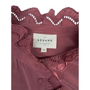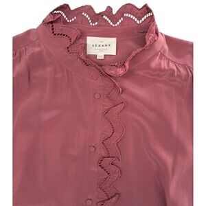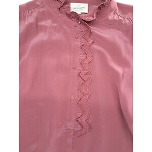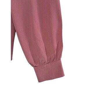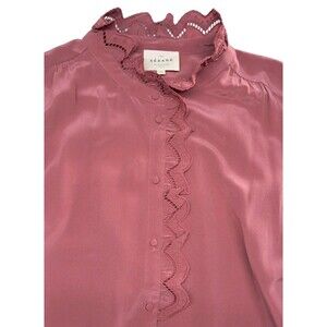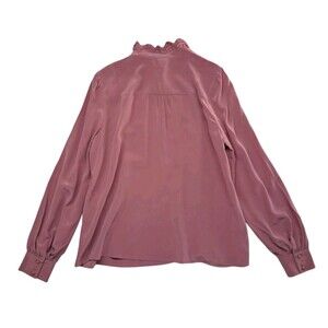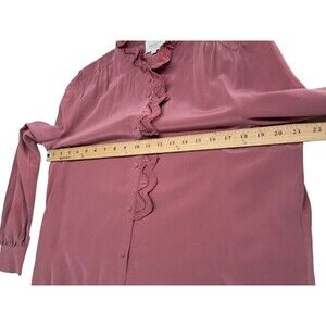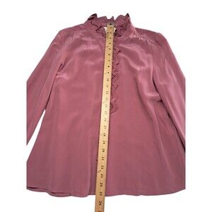 Elegant pink blouse with ruffle details. Long sleeves and button-up front. Perfect for a chic look.