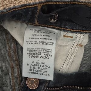 Three pair of boys size 8 SLIM jeans - 2 pair of Wrangler and 1 pair of Levi’s. All have adjustable waist. Selling all 3 pair together.