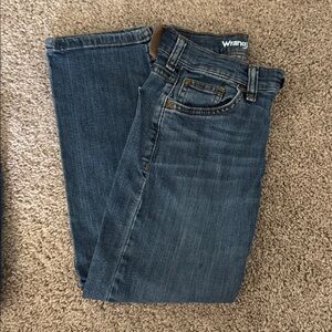 •Dark Wrangler jeans has small defect on front of jeans (shown in photos), the adjustable waist on one side has come out but still adjustable on the other side.